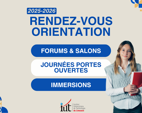 Venez à la rencontre des enseignants et des étudiants de l’IUT du Limousin à l’occasion de différents rendez-vous d’information et d’orientation.
