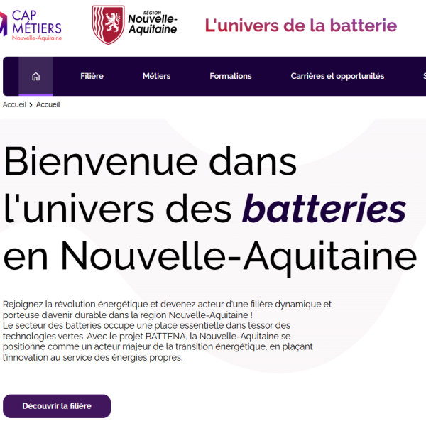 Porté par Cap Métiers Nouvelle-Aquitaine, ce portail donne accès aux informations stratégiques pour construire un projet de formation et professionnel en lien avec les métiers de la filière batterie.